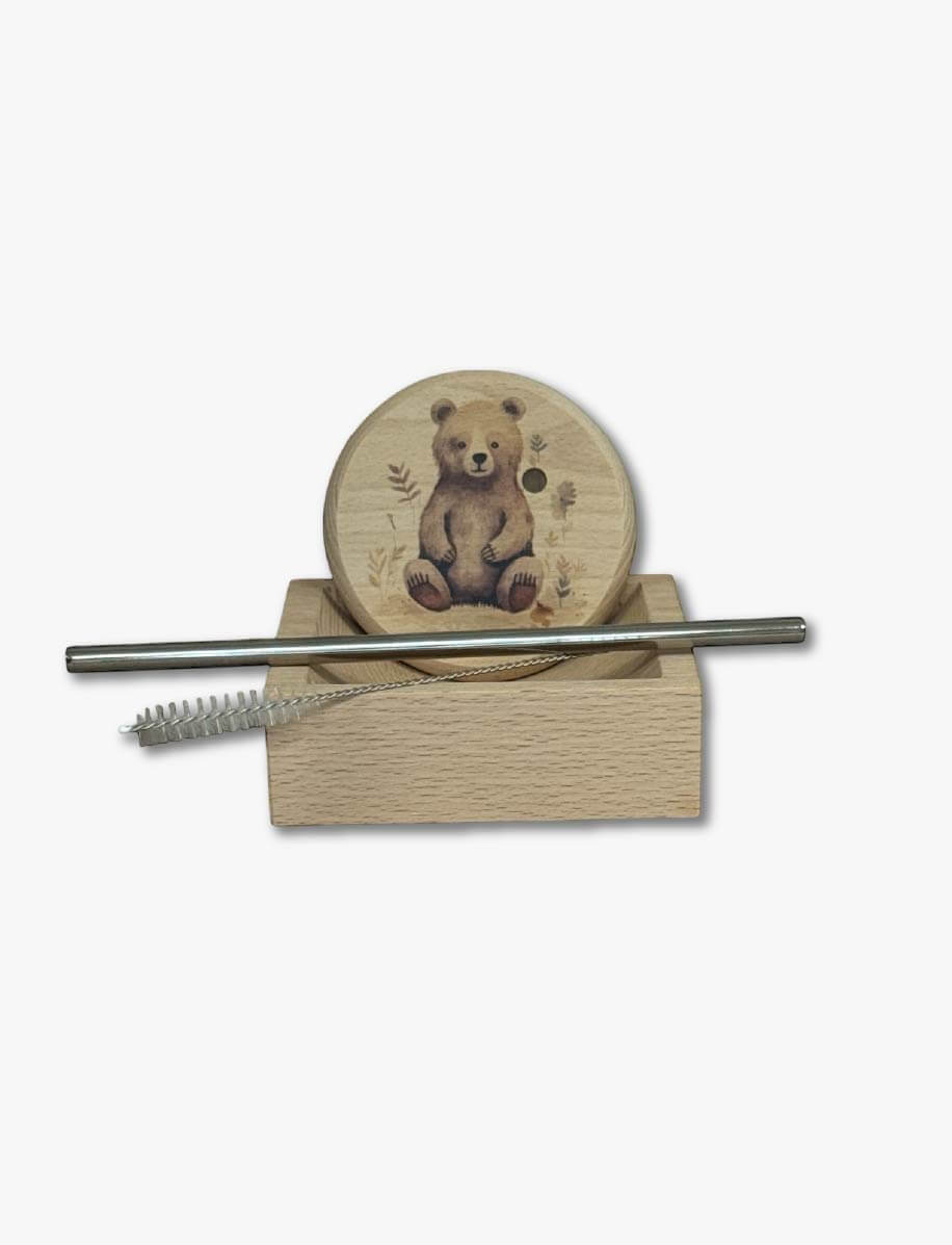 „Dein süsser Schutzengel.“ | Holz Glasabdeckung mit buntem Motiv inkl. Edelstahlstrohhalm und Reinigungsbürste